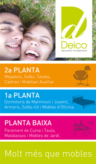 Disseny de publicitat exterior amb lones i vinils de gran format, i senyalètica exterior per a la botiga de mobles Deico de Vinyols i els Arcs.