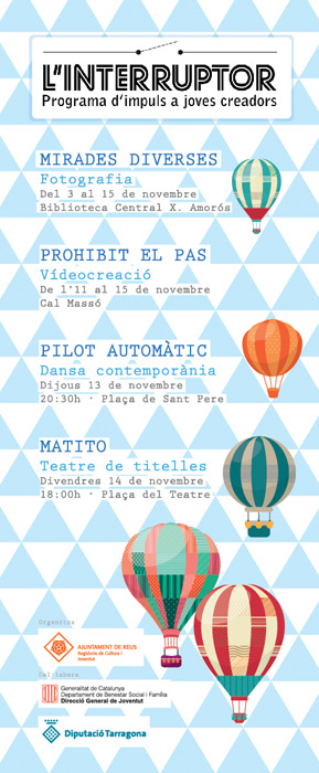 L’Interruptor Guiu Disseny06/11/201416/03/2017Cartells i altres Navegació d'entrades AnteriorSegüent Cartell desplegable a dues cares per a L‘Interruptor, el programa d’impuls a joves creadors, que impulsa la regidoria de Cultura i Joventut de Reus. Cartell Interruptor 2014 Desplegable Interruptor 2014 Comparteix això: Share on X (S'obre en una nova finestra) X Comparteix al Facebook (S'obre en una nova finestra) Facebook M'agrada S'està carregant... Relacionats