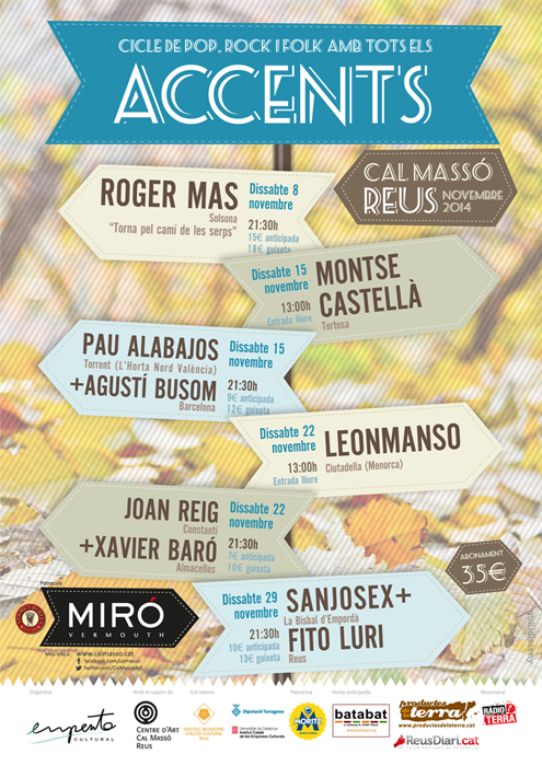 Accents Guiu Disseny27/11/201413/01/2015Cartells i altres,Web Navegació d'entrades AnteriorSegüent Cartell, entrades, pancarta i banners per a ACCENTS, el Cicle de pop, rock i folk fet al Centre d’Art Cal Massó de Reus el 2014. Cartell Accents 2014 Intersitial banner Entrades (Foto Cal Massó) Cartell al capvespre Flyers al capvespre Pancarta (Foto Cal Massó) Comparteix això: Share on X (S'obre en una nova finestra) X Comparteix al Facebook (S'obre en una nova finestra) Facebook M'agrada S'està carregant... Relacionats