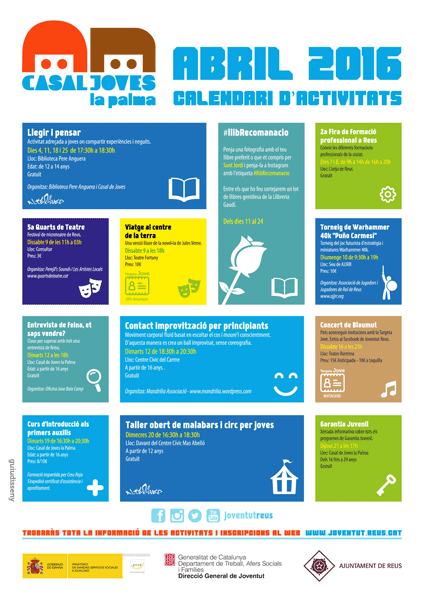 Calendari_joventut_abril 19/04/2016 Torna a: Casal Joves La PalmaResolució completa (424 × 600) Image navigation Imatge següent Cartell calendari Joventut A3