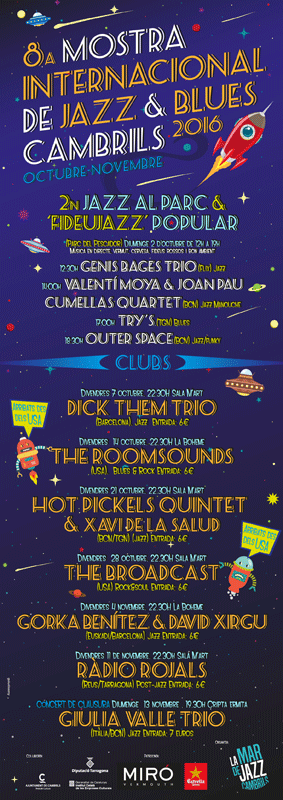 Disseny de cartell promocional, flyer, entrades, capçaleres i pancarta de la 8a Mostra Internacional de Blues & Jazz de Cambrils 2016.